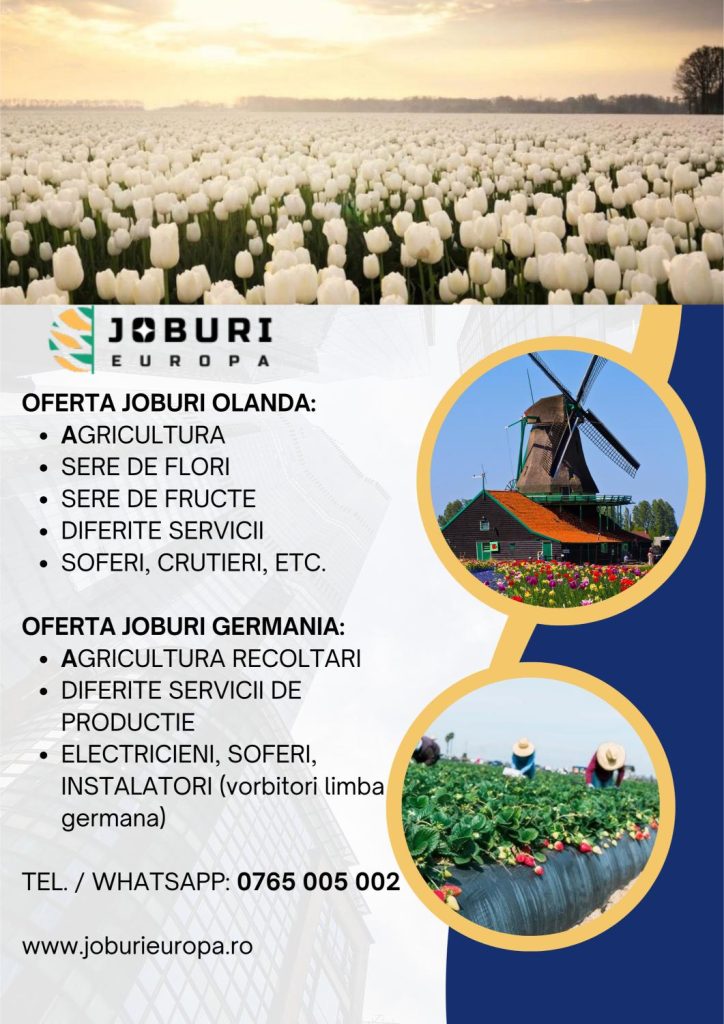 Descoperă locuri de muncă în Olanda, cu oferte sigure și atractive în diverse sectoare, de la agricultură la ospitalitate. Aplică acum și profită de salarii competitive și oportunități de relocare.
